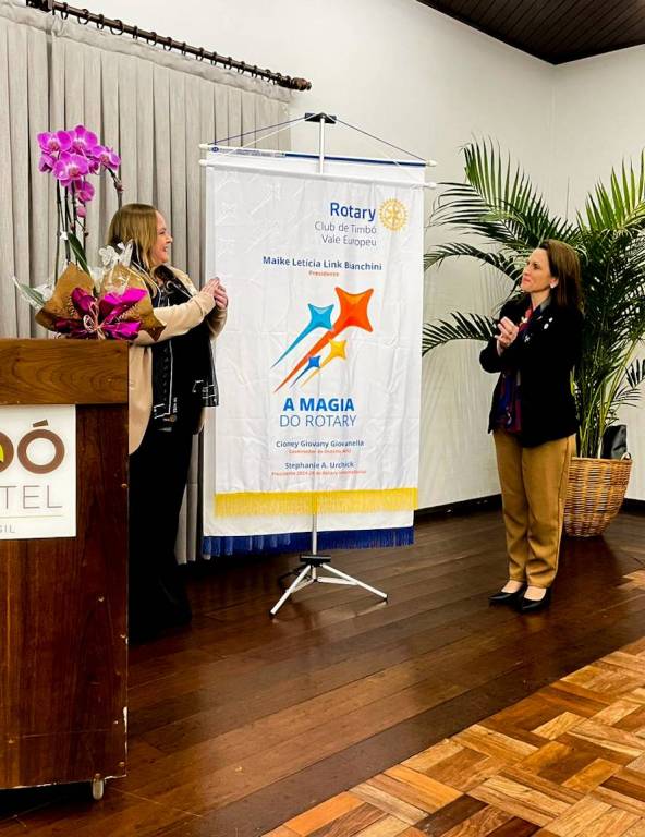 Após ser empossada, a Maike Letícia Link Bianchini, gestão 2024-2025, proferiu seu juramento de presidente e posteriormente, dirigiu-se aos convidados, para realizar seu discurso, observando que “Aceitar esta posição é uma oportunidade para retribuir à nossa comunidade e continuar o legado do Rotary. O Rotary é uma rede global de pessoas comprometidas com a promoção do bem, da amizade e da paz. Neste ano, sob o lema ‘A Magia do Rotary’, concentraremos nossos esforços em transformar vidas através de nossos projetos e ações, seguindo o exemplo inspirador de Stephanie Urchick. Recordamos as palavras de Paul Harris: ‘A felicidade, evasiva para quem a busca, vem sem esforço para quem serve’. Somos mais de 1,2 milhão de amigos rotarianos em todo o mundo, unidos por um propósito comum: fazer a diferença em nossas comunidades e no mundo. Peço a todos que se juntem a nós com paixão e comprometimento neste ano. Juntos, faremos história no Rotary Club de Timbó Vale Europeu. Que possamos, com determinação e trabalho árduo, tornar nosso futuro mais luminoso e transformador para todos. Agradeço pelo apoio e que este ano rotário seja repleto de realizações mágicas. Que Deus nos abençoe”.