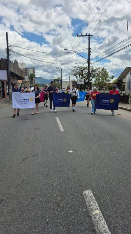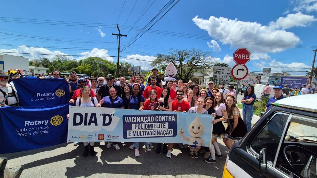 Participação da Família Rotária de Timbó no Desfile Alegórico da 32ª Festa do Imigrante de Timbó, com enfoque na erradicação da Poliomielite no Brasil e no Mundo.